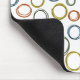 Este mouse pad tem um design Boho de círculos sobrepostos em tons retrorados de verde, marrom, azul e cinzas.