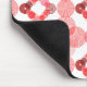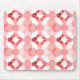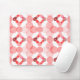 Esse mouse pad tem um design geométrico de círculos concêntricos em tons de vermelho formando dois quadrados em um campo de branco.
