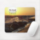 Ondas selvagens caem em rochas de píer no pôr do sol com citações religiosas.
