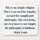 " Esta é minha religião simples. Não há nenhuma necessidade para templos; nenhuma necessidade para filosofia complicada. Nosso próprio cérebro, nosso próprio coração é nosso templo; a filosofia é bondade." - Dalai Lama