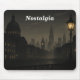 Uma paisagem urbana escura com prédios do estilo vintage e lâmpadas de rua.