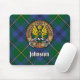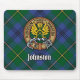 Crachá da crista Clan Johnston cercado por uma correia e fivela sobre fundo tartano. Texto personalizado.