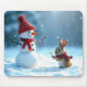 Um bonitão de neve com um chapéu vermelho e cachecol se posiciona ao lado de um pequeno coelho com texto Feliz de Natal na neve