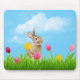 Tulipas de primavera na grama com coelho fofo e fundo azul