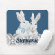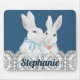 Única, fofa e elegante! Um design de mouse para qualquer amante de coelho coelho, e é personalizado! Adicione um nome a este padrão fofo que inclui um par de coelhos brancos românticos olhando sobre uma borda antiga. O fundo é azul. Seu nome estará em um azul mais escuro em uma fonte bonito em itálico. - fácil de personalizar usando o modelo de texto e o menu de edição. Arte original e design de Tuzi Williams.