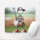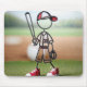 Um personagem de boné vestido como um jogador de beisebol está na grama verde de um campo de beisebol segurando um taco e uma luva