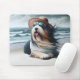 Cachorro-frio vestindo um chapéu de sol e óculos de sol na praia em um dia de vento.