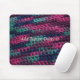 Este mousepad caracteriza um design do teste padrão do crochet, uma mistura de aumentou, azuis, verdes e roxo escuro.