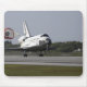 Com a calha de arrasto descontinuada, a descoberta do ônibus espacial pousa na pista 33 no Shuttle Landing Facility no Kennedy Space Center, na Flórida, em destaque com Cape Canaveral.