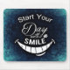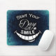 Comece seu dia com um design de texto branco de sorriso em azul, mouse pad.