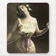 Fotografia do vintage de uma jovem mulher nos bloomers e em um espartilho. Está guardarando os laços do espartilho como se está pronta para o puxar mais apertado mesmo que esteja incredibly apertado já