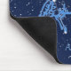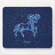 Mouse pad no símbolo do zodíaco para Aries em azul-prata-suave, sobreposto com as estrelas da constelação, contra um fundo céu estrelado de azul-da-noite profundo