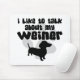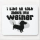 Produtos engraçados do Dachshund! "Eu gosto de falar sobre meu weiner" sou um presente parvo do amante do cão. Uma silhueta do cão está no meio, com um impressão da pata na parte traseira.