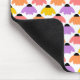 Este mouse pad tem um design de flores espalhadas sobre o design em amarelo, laranja, rosa e roxo em um campo de branco.
