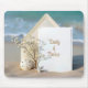 Um convite de casamento para vazios é elegantemente colocado contra um pano de fundo de praia, acompanhado por delicadas flores brancas de giro, estrelas e um dólar de areia. Os nomes podem ser alterados ou eliminados.