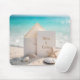 Um cartão de vazio e um envelope descansam em uma praia arenosa cercada por conchas, estrelas-do-mar e fundo oceânico turquesa. Os nomes podem ser alterados ou eliminados.