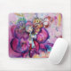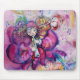 Corneta colorida, branca, rosa-rosa engraçada, tocando coruja com uma coruja expressiva e notas musicais alegres, flores, folhas em vermelho vibrante, fúcsia, violeta, roxo, azul, cores brancas, pintura aquarela de Búlgaro Lumini (c)