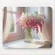 Um pote Mason claro segura um buquê vibrante de flores coronárias cor-de-rosa e brancas, caindo na luz solar macia, passando por uma janela