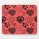 Este mouse pad tem um design de repetição de corações com diferentes dentro gráficos em um campo de branco.