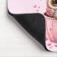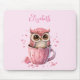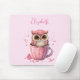 Mousepad com uma imagem adorável de uma coruja sentada numa caneca de café. Corações pairando e um rosa solteiro colocado no fundo da xícara.