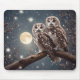 Par de corujas empoleiradas em um galho de árvore com uma lua de cheio e estrelas em céu azul escuro.