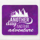 Um mouse pad com uma frase otimista da aventura que diz: Outro dia outra aventura. Uma imagem com o sol a espreitar por detrás de algumas montanhas. Colocado sobre um fundo roxo.