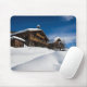 Pasta de fotos com um casal tradicional de cabanas de madeira ou chalés cobertos de neve sob um céu azul numa área de estância de esqui nos Alpes, na Áustria, no inverno.