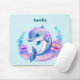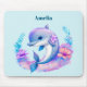 Mouse com uma ilustração adorável. Um golfinho azul e roxo cercado por bonito plantas submarinas coloridas.