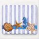 Cor de água original pintada por Sandra Gale, apresentando peixes-estrela, cavalos-do-mar, tartarugas e conchas sobre um fundo de listras azuis verticais translúcidas. Excelente para o verão, casas de praia, bangalôs ou para qualquer pessoa que ama a praia, o oceano ou os peixes.
