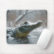 Um crocodilo é parcialmente submerso em água gelada, com neve cobrindo seu focinho e gelo pendurados na boca
