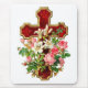 A cruz vermelha e dourada com uma profusão de flores bonito foi cuidadosamente retocada para trazer os maravilhosos detalhes. Há lírios brancos de Páscoa e rosas rosadas.