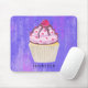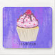 uma MOUSEPAD com uma ilustração de um cupcake com aspecto delicioso. Glacé rosa e garoa de chocolate. Um cupcake amarelo e uma framboesa no topo. Meu Deus! O fundo é uma textura de abstrato roxo com pequenos corações salpicados por todo o lado.
