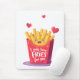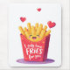 A cute and colorful cartoon illustration of a red French fries carton with a happy kawaii smiling face. The design features a floating red heart and the romantic funny pun quote "I only have FRIES for you". The image has a white sticker border, making it perfect for Valentine's Day greeting cards, fast food lovers, and humorous romantic gifts. Isolated design.