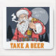 Ilustração de Papai Noel, com cabelo branco e barba, vestindo óculos, segurando uma garrafa de cerveja em sua mão direita e fumando um charuto com a mão esquerda, vestindo um traje vermelho com uma trim branca de pelo, um cinturão preto com uma fivela de ouro e um botão branco. O fundo é azul escuro com silhuetas de pinheiros e um círculo de cinzas grandes com as palavras "PARTY CHRISTMASS..." escritas sobre ele. As palavras "TAKE A BEER" são escritas em letras laranja na parte inferior da imagem. O estilo é desenhado com contornos em negrito e cores planas.