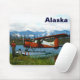 Um piloto de arbusto fica perto do seu flutuador de Havilland Canada DHC-2 Beaver na costa de um lago no extremo norte; montanhas e árvores estão à distância. A leitura de texto "Alaska" também é exibida. Esta imagem foi derivada, em parte, de uma foto do Serviço de Pesca e Vida Selvagem dos EUA.