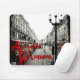 Cena de Londres negra e branca com cor seletiva nos ônibus vermelhos ao longo da rua.