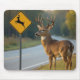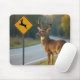 A buck stands alertly next to a road sign, which ironically displays a leaping deer, beside a quiet road stretching through a forested area