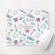 Mousepad com um padrão teórico dental. Apresentando ilustrações coloridas de dentes, escovas de dentes e várias ferramentas dentárias.