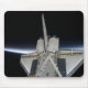 Descoberta de Shuttle Espacial intersetando a fina linha da atmosfera terrestre, enquanto ancorada com a Estação Espacial Internacional em destaque com o STS-131.