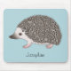 A ilustração original do desenho de Destei de um lindo animal africano Pygmy Hedgehog como padrão. O ouriço está de pé e é fotografado do lado. O ouriço tem dedos cor-de-rosa e um sorriso no rosto. A cor de fundo é azul claro e há uma área de texto personalizável para um nome ou outro texto personalizado.