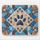 Um padrão geométrico incorpora estampas grandes e pequenas de pata de cão, dispostas em design simétrico e colorido