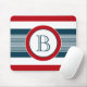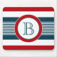 Design de temas náuticos com decoração em forma de monograma em forma redonda, sobre fundo listrado azul, branco e vermelho
