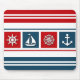 Design náutica com barco à vela, âncora, bússola e decoração das rodas de vela em fundo listrado