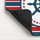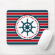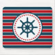 Design náutico com decoração das rodas de vela em forma redonda com estrelas sobre fundo listrado vermelho, azul e branco