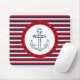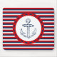Design náutico com decoração da âncora desenhada à mão sobre fundo riscado a azul, vermelho e branco