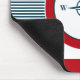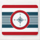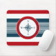 Design náutico com decoração em forma de bússola, em fundo listrado a azul, vermelho e branco