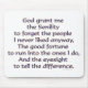 O deus concede-me o Senility para esquecer as pessoas que eu nunca gostei de qualquer maneira, a boa fortuna a funcionar em essas eu, e o eyesight digo a diferença. - Paródia da oração da serenidade. Provérbio engraçado e cómico.