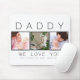 Adicione suas fotos e mensagem de Dia de os pais a este bonito tapete de mouse personalizado com foto do "Pai We Love You". Um espaço para 3 imagens e espaço personalizado com seus nomes na parte inferior. O texto é definido em uma fonte moderna, em azul e preto. Adequado para Dia de os pais, aniversários ou Natal.
