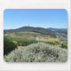Uma perspectiva cênica do Arboretum de Canberra apresenta uma paisagem verde-luxuosa sob um céu azul claro, com a Montanha Negra erguida por uma torre de comunicação ao fundo. Uma variedade de vegetação, incluindo fileiras de árvores e arbustos, é complementada por um vislumbre de massas de água à distância.