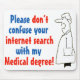 O médico diz: "Por favor, não confunda sua pesquisa na internet com o meu diploma de medicina". Cartoon de um médico no seu casaco de laboratório branco.